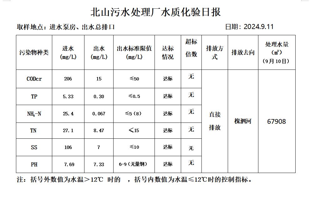 北山污水处理厂水质化验日报(2024.9.11)