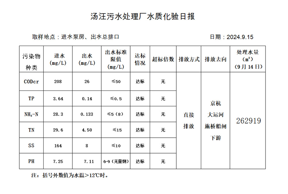 汤汪污水处理厂水质化验日报(2024.9.15)