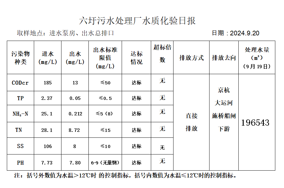 六圩污水处理厂水质化验日报(2024.9.20)