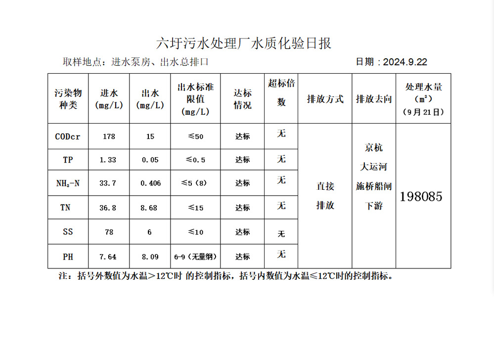 六圩污水处理厂水质化验日报(2024.9.22)