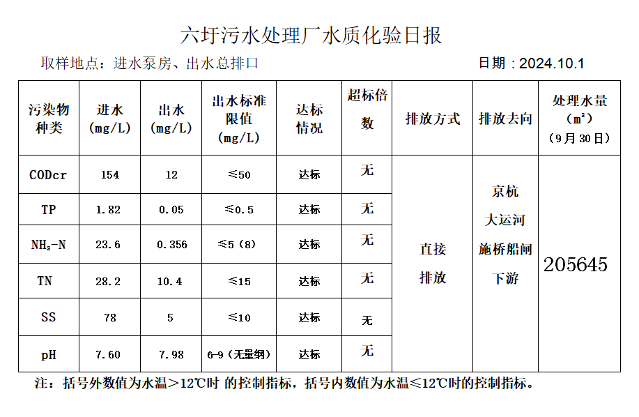 六圩污水处理厂水质化验日报(2024.10.1)