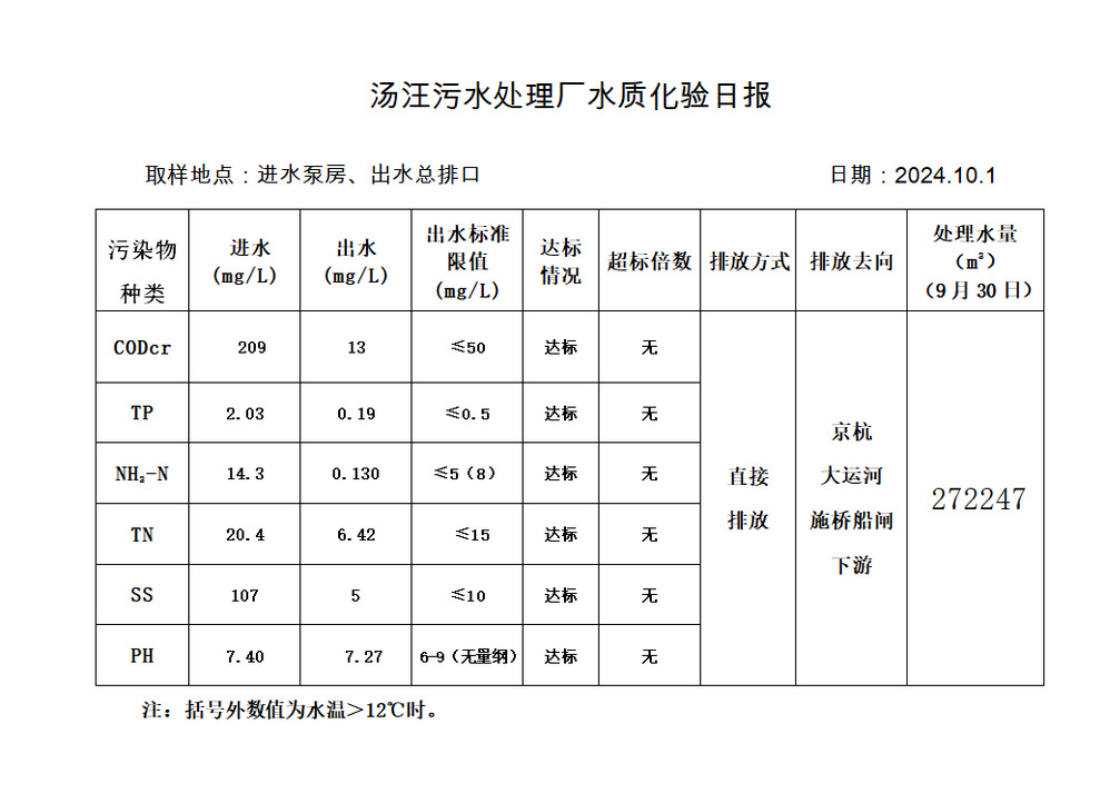 汤汪污水处理厂水质化验日报(2024.10.1)