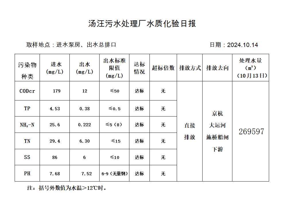 汤汪污水处理厂水质化验日报(2024.10.14)