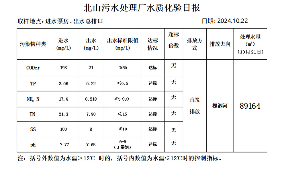 北山污水处理厂水质化验日报(2024.10.22)