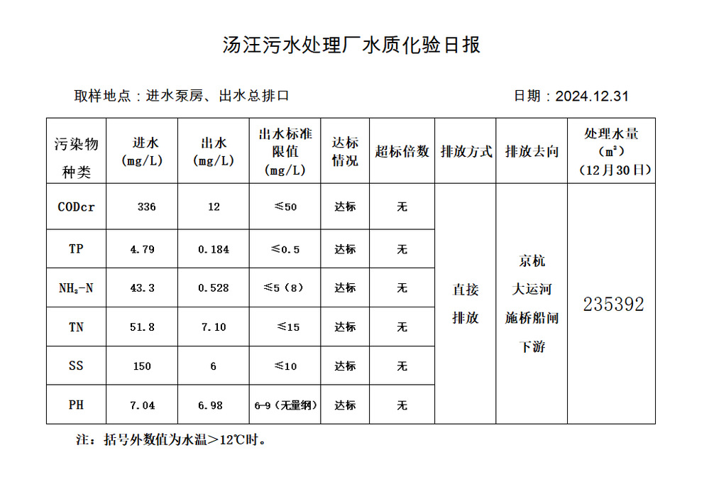 汤汪污水处理厂水质化验日报(2024.12.31)