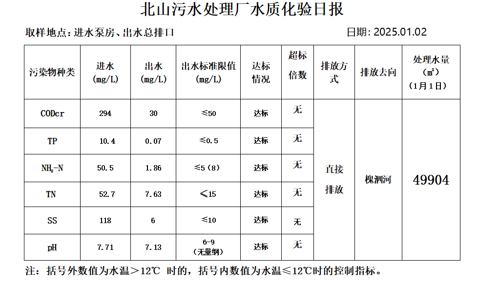 北山污水处理厂水质化验日报(2025.1.2)
