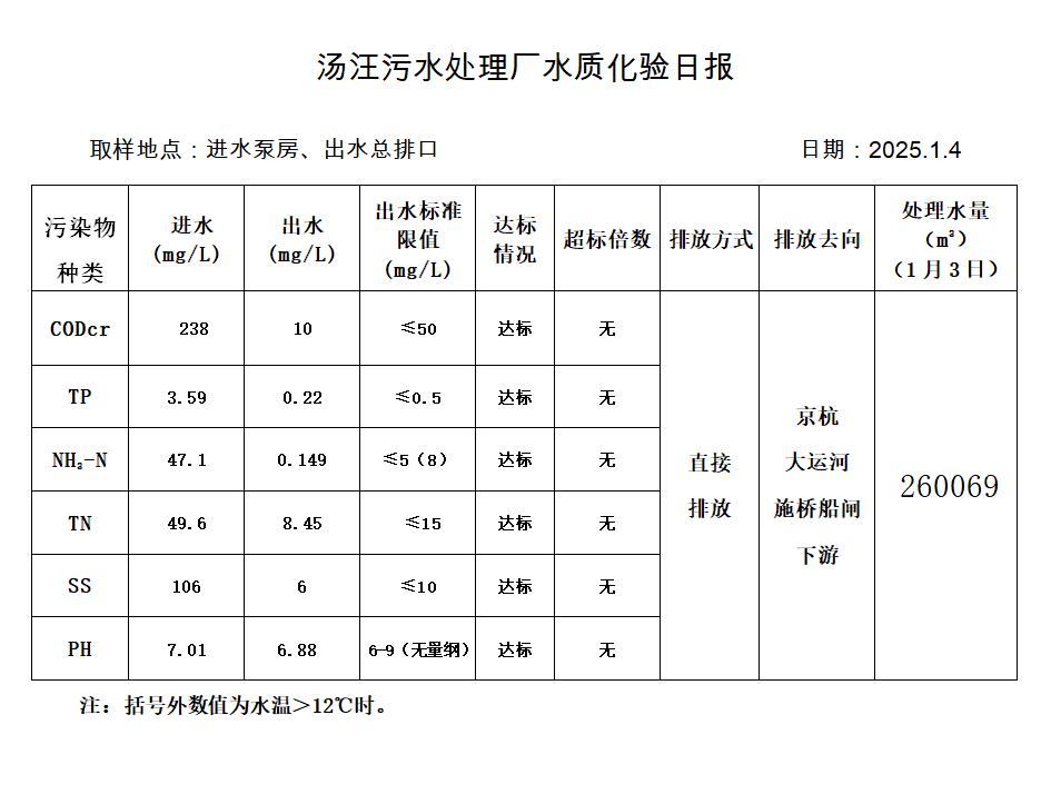 汤汪污水处理厂水质化验日报(2025.1.4)