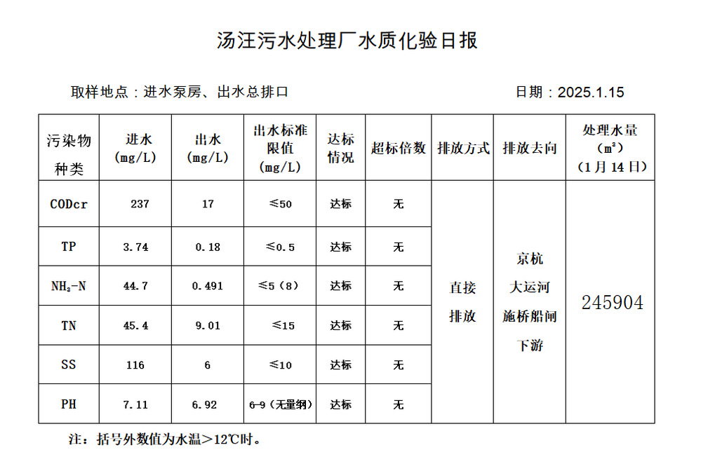 汤汪污水处理厂水质化验日报(2025.1.15)