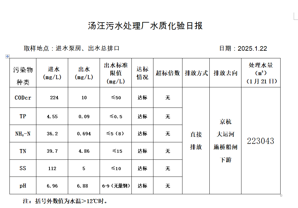 汤汪污水处理厂水质化验日报(2025.1.22)