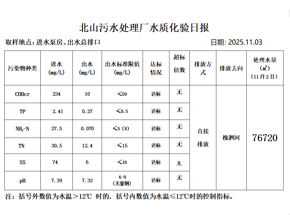 北山污水处理厂水质化验日报(25.11.3)