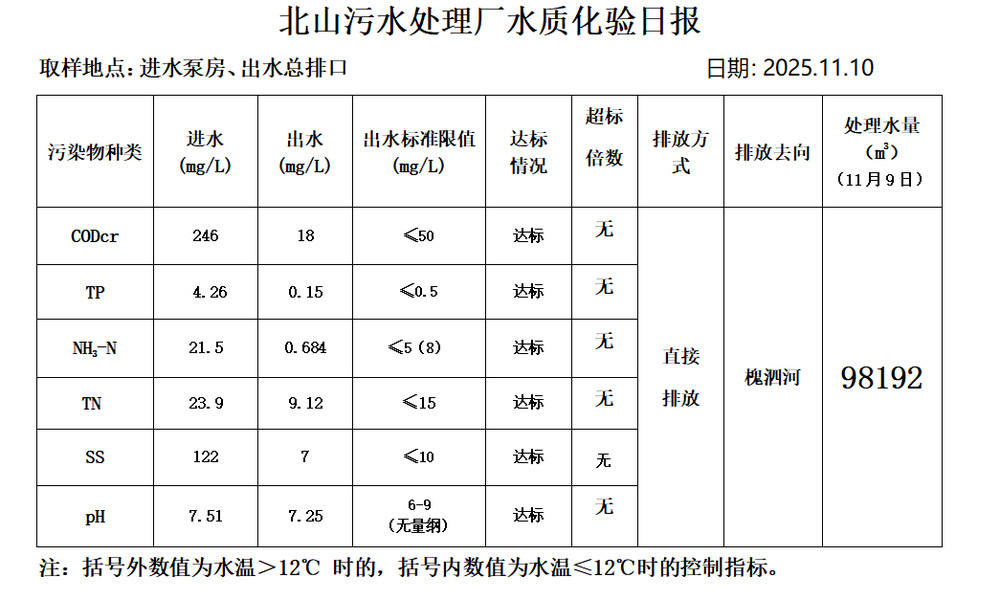 北山污水处理厂水质化验日报(25.11.10)