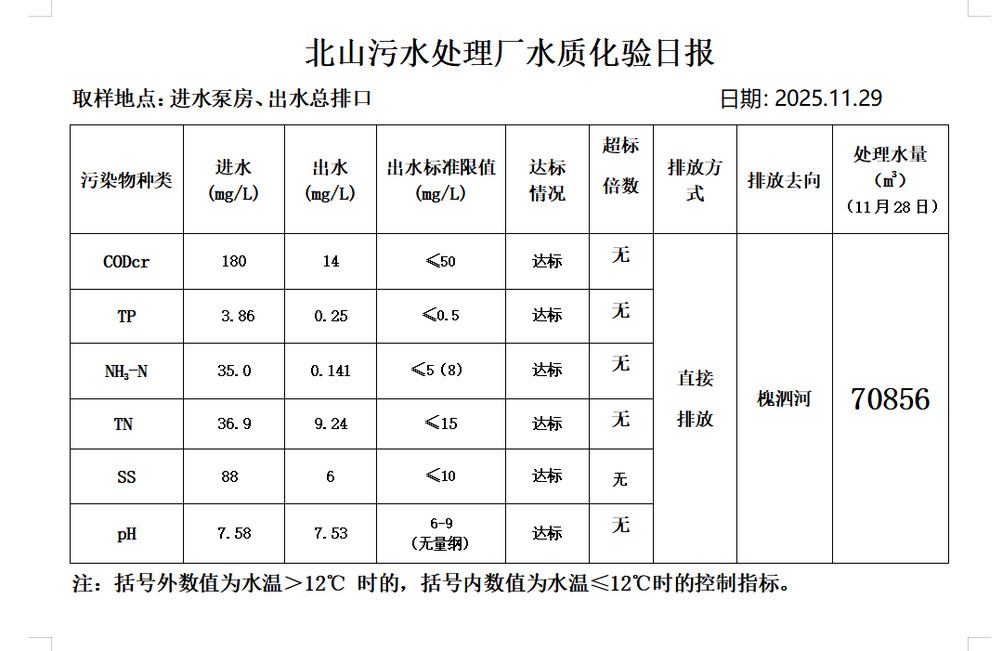 北山污水处理厂水质化验日报(25.11.29)