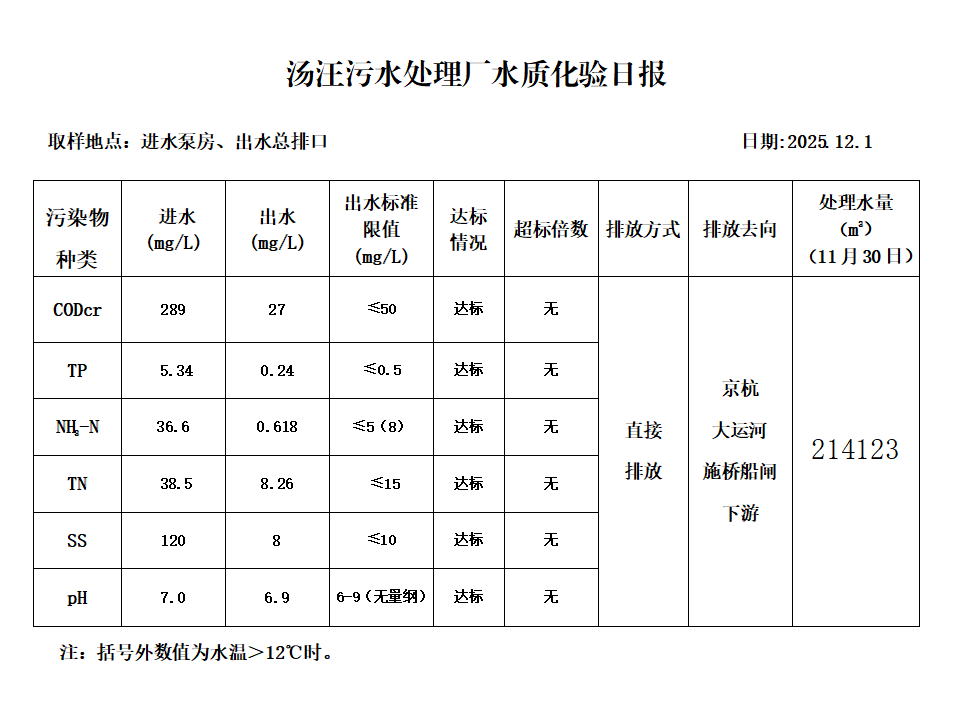 汤汪污水处理厂水质化验日报(2025.12.1)