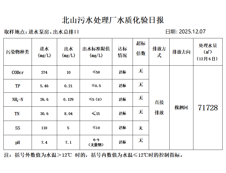 北山污水处理厂水质化验日报(2025.12.7)