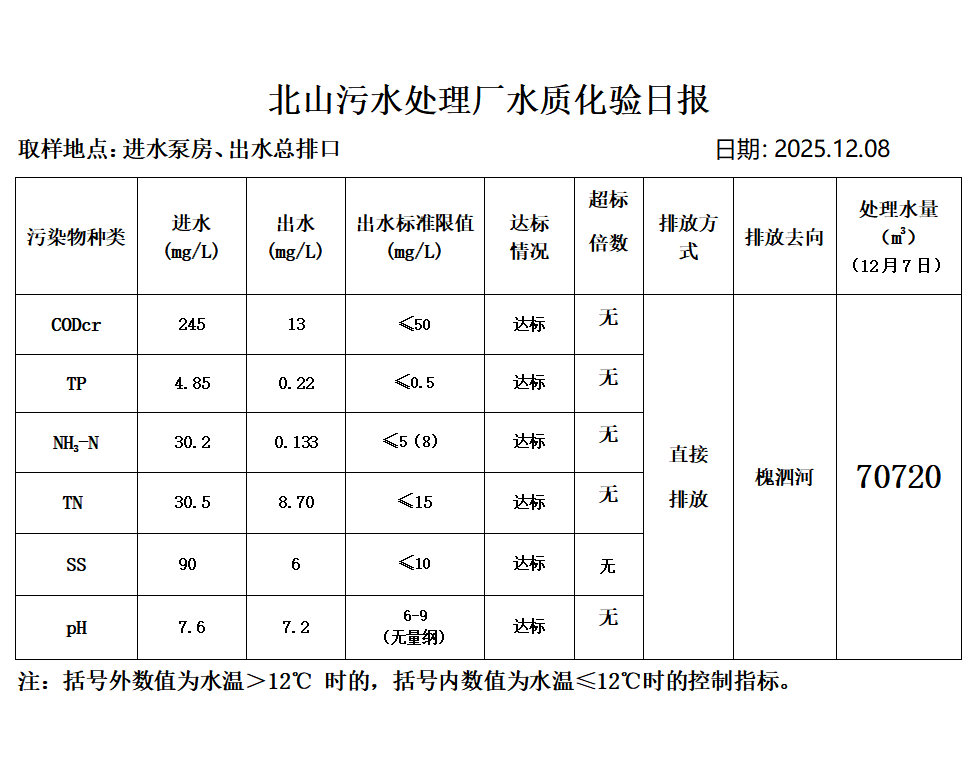 北山污水处理厂水质化验日报(2025.12.8)