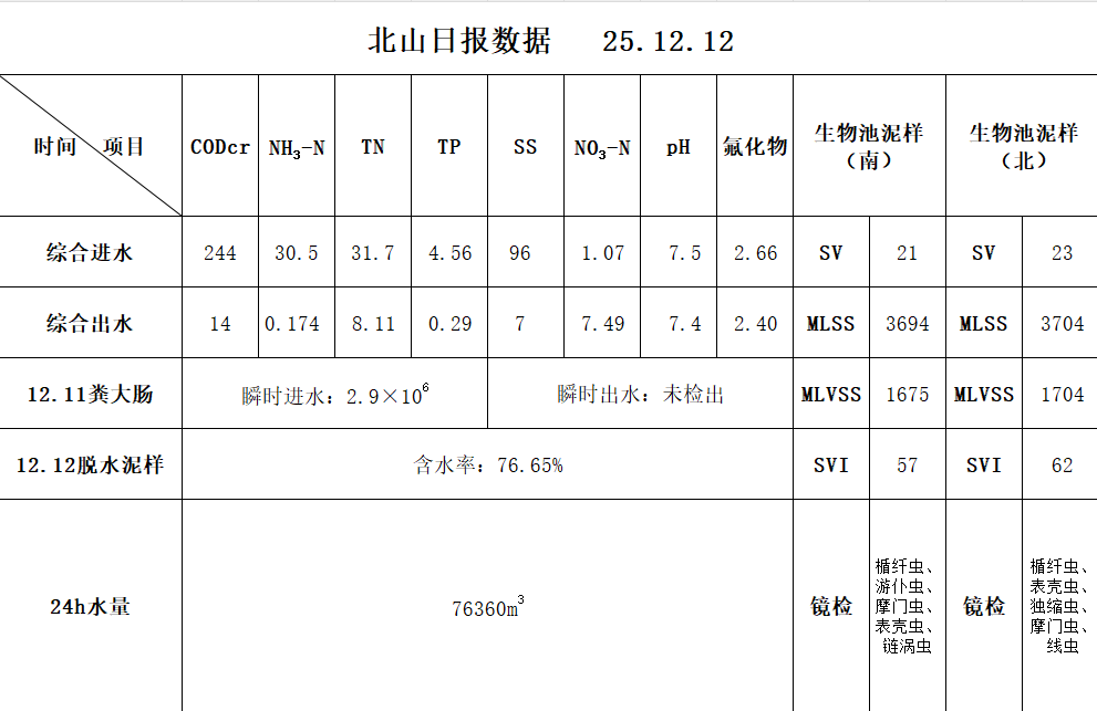 北山污水处理厂水质化验日报(2025.12.12)