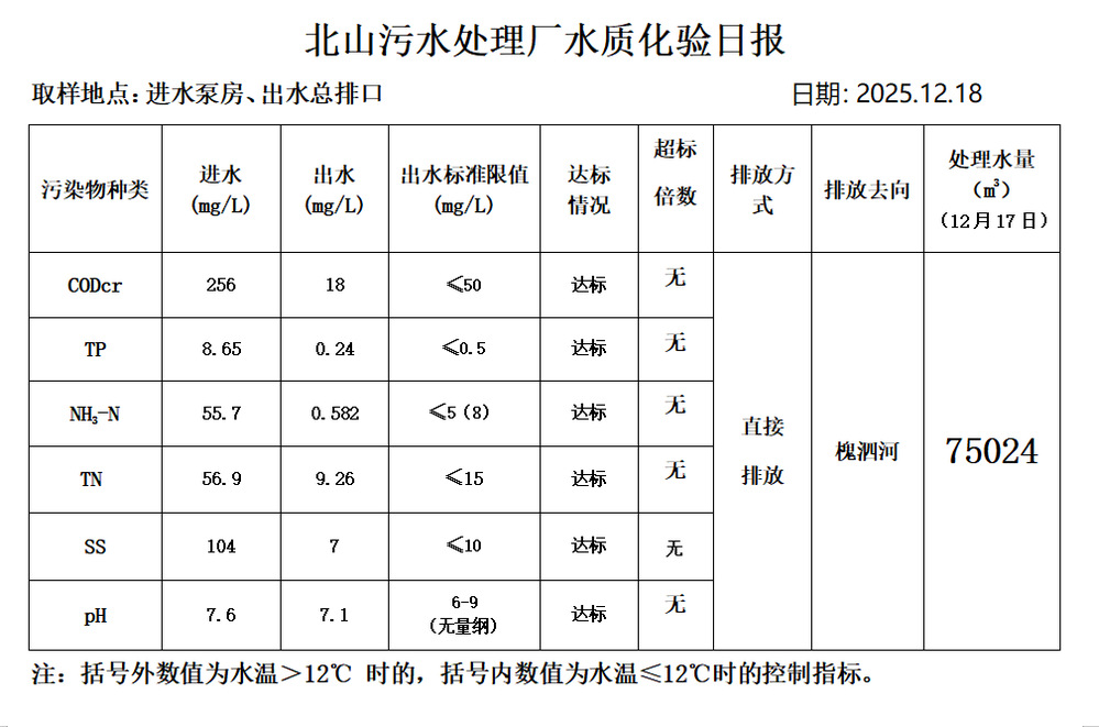 北山污水处理厂水质化验日报(2025.12.18)