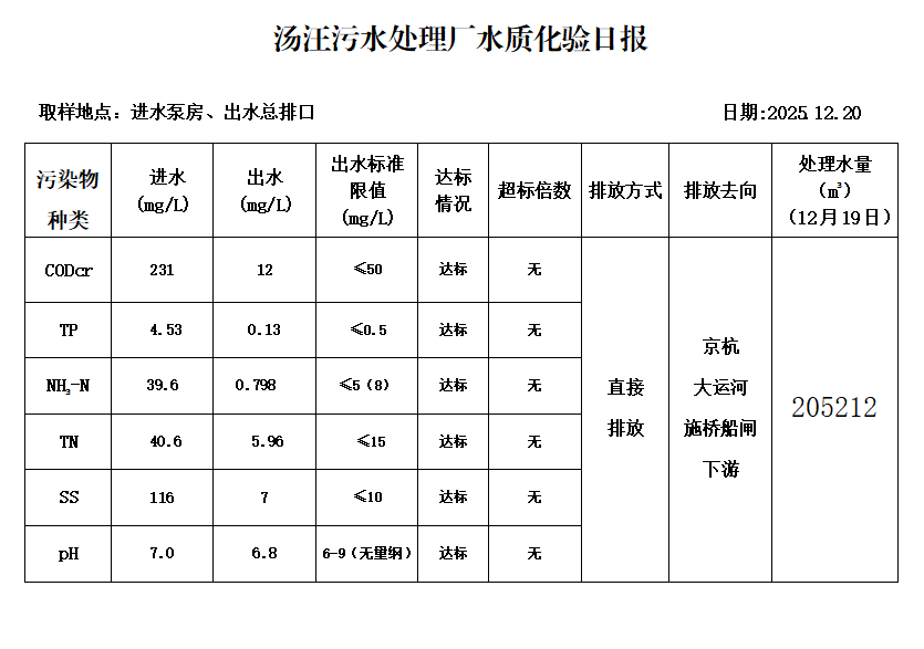 汤汪污水处理厂水质化验日报(2025.12.20)