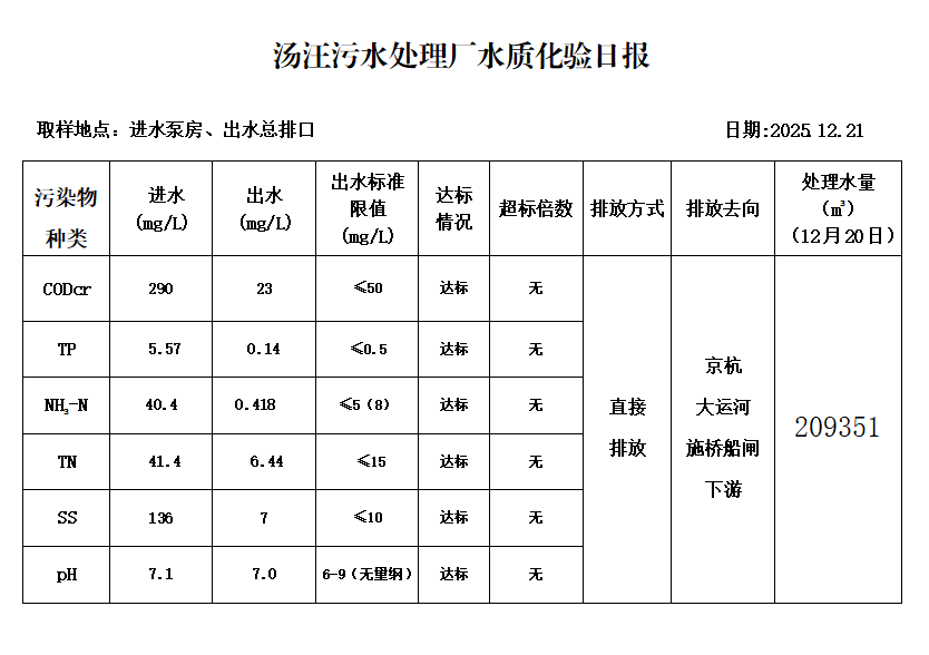 汤汪污水处理厂水质化验日报(2025.12.21)