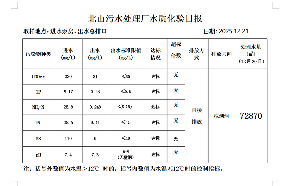 北山污水处理厂水质化验日报(2025.12.21)