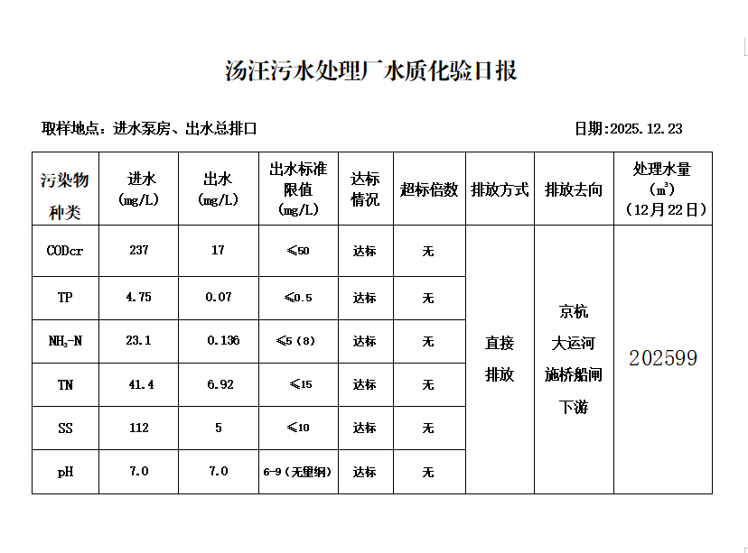 汤汪污水处理厂水质化验日报(2025.12.23)