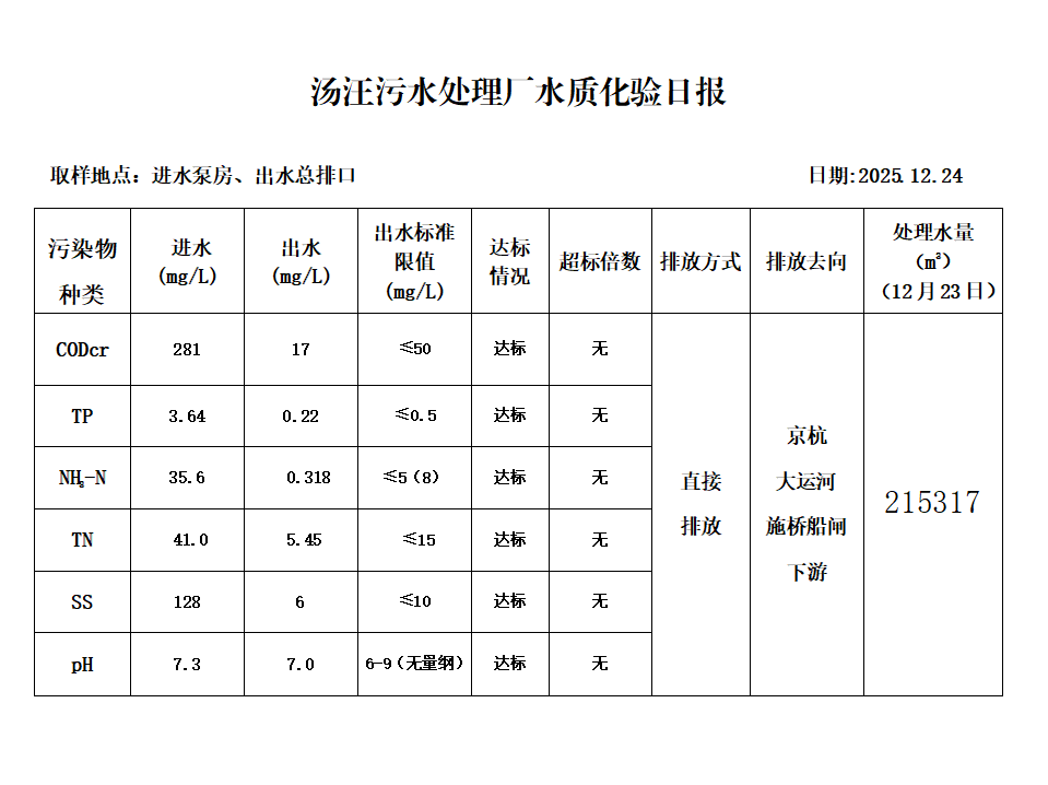 汤汪污水处理厂水质化验日报(2025.12.24)