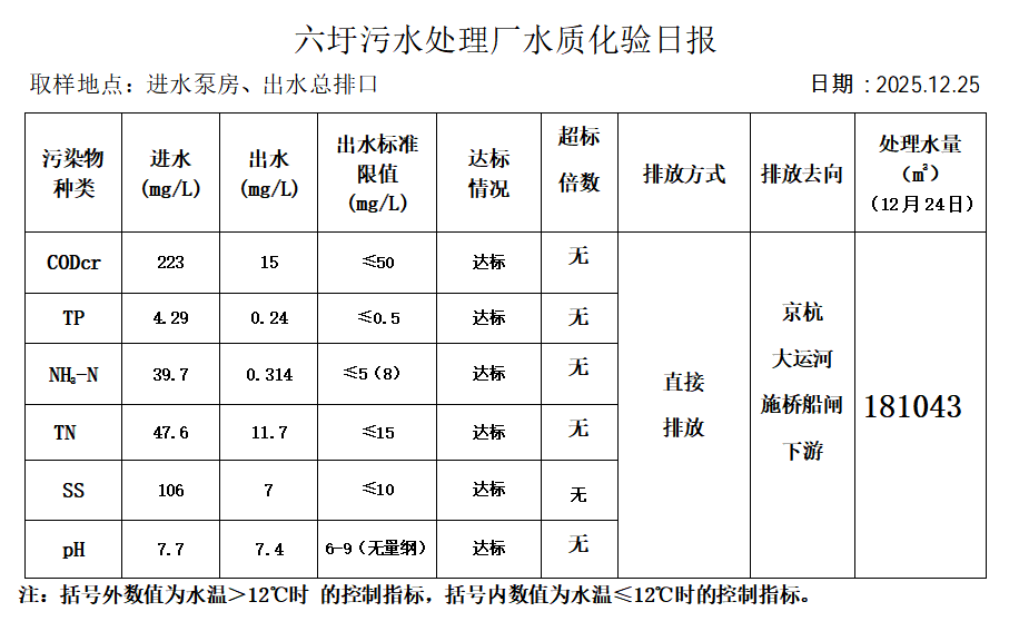 六圩污水处理厂水质化验日报(2025.12.25)