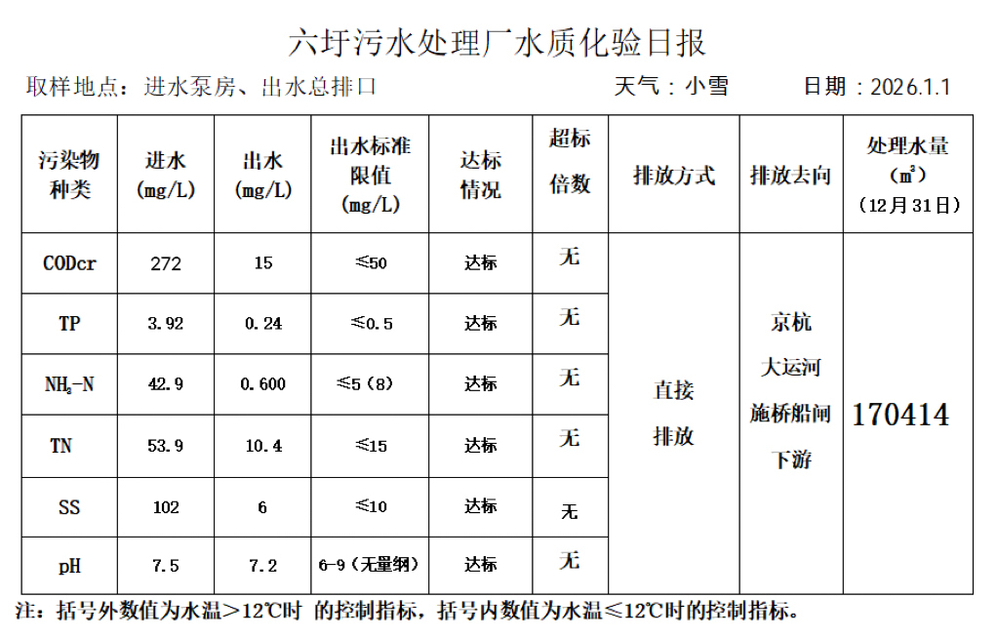 六圩污水处理厂水质化验日报(2026.1.1)