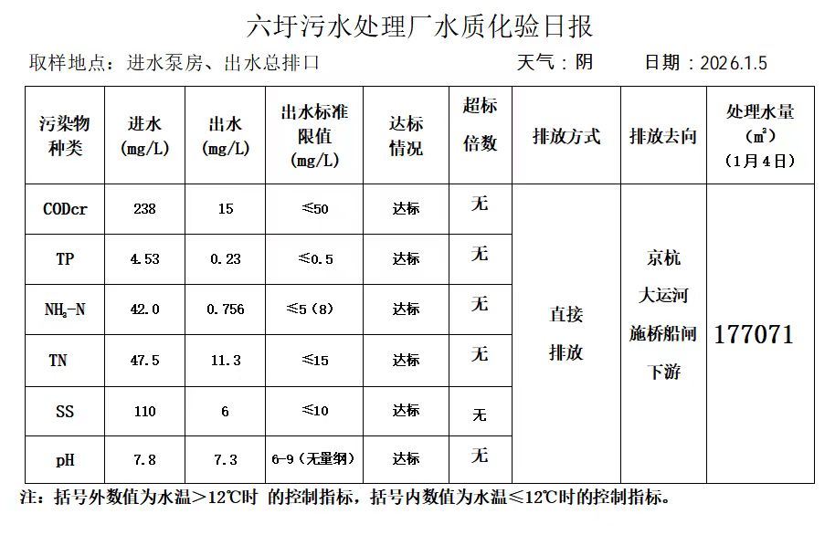 六圩污水处理厂水质化验日报(2026.1.5)