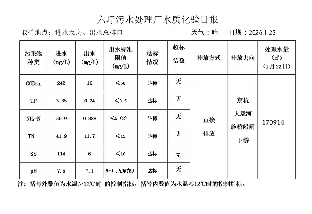 六圩污水处理厂水质化验日报(2026.1.23)
