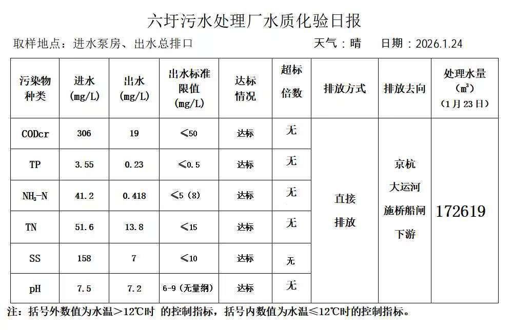六圩污水处理厂水质化验日报(2026.1.24)