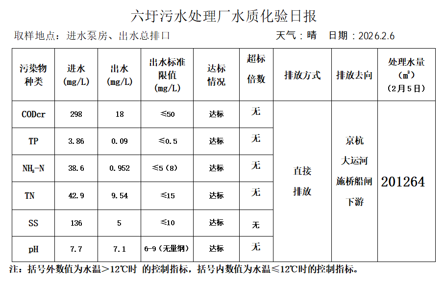 六圩污水处理厂水质化验日报(2026.2.6)