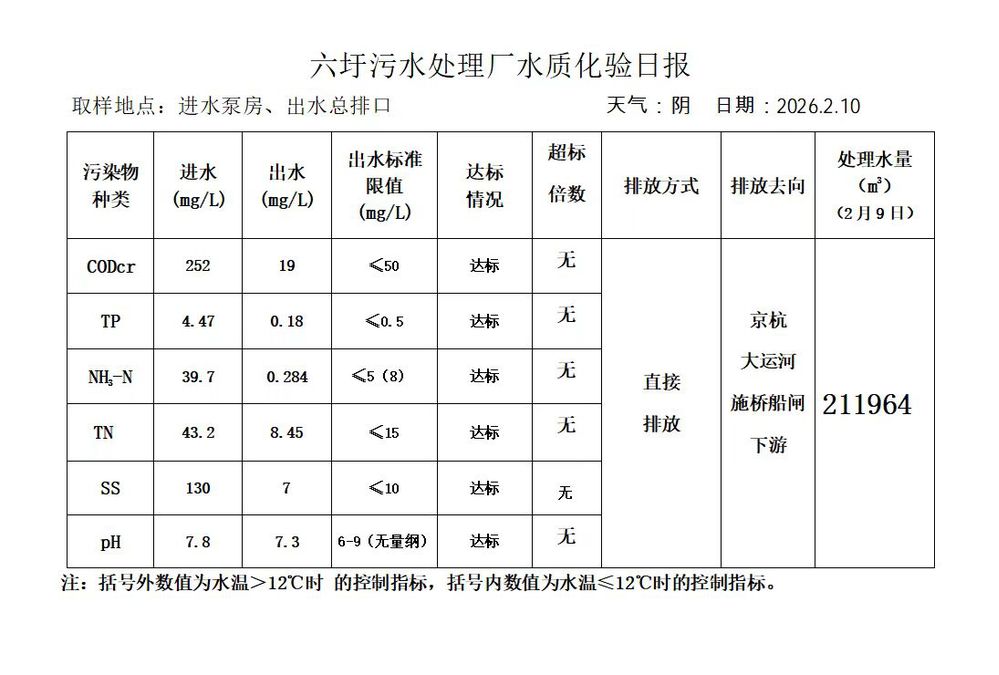 六圩污水处理厂水质化验日报(2026.2.10)