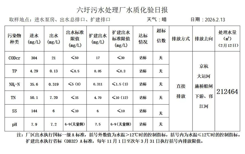 六圩污水处理厂水质化验日报(2026.2.13)