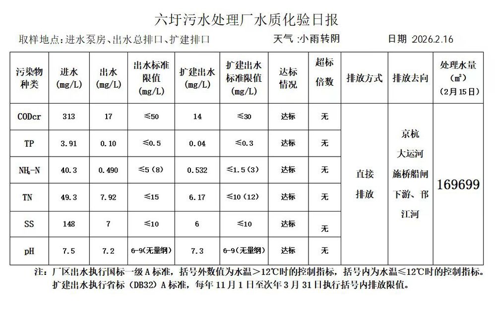 六圩污水处理厂水质化验日报(2026.2.16)
