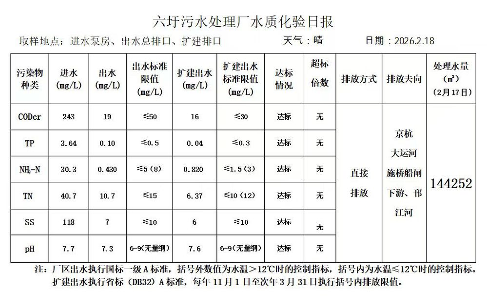 六圩污水处理厂水质化验日报(2026.2.18)