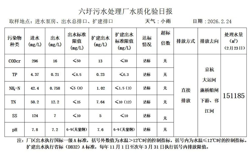 六圩污水处理厂水质化验日报(2026.2.24)