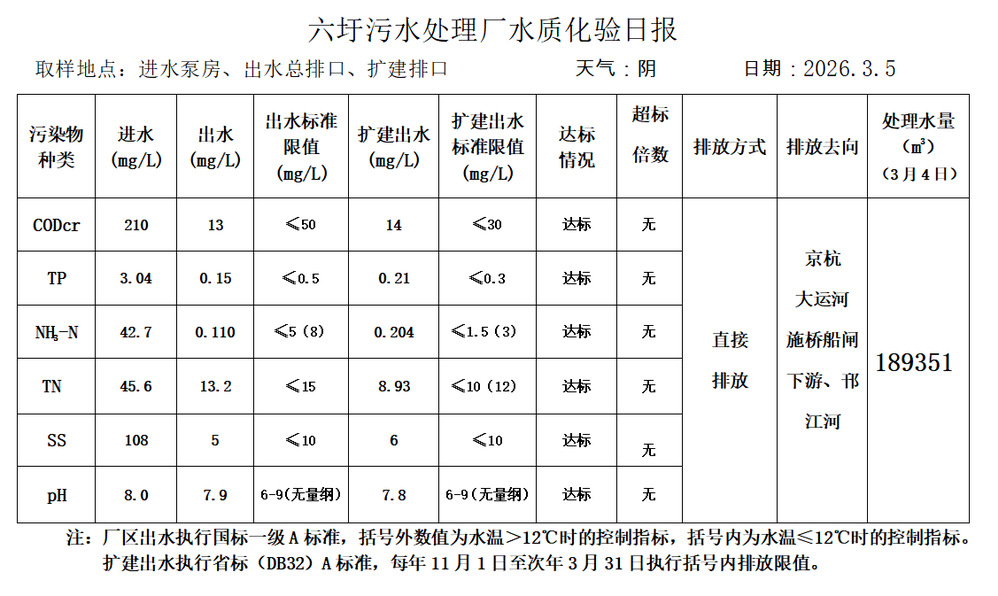 六圩污水处理厂水质化验日报(2026.3.5)