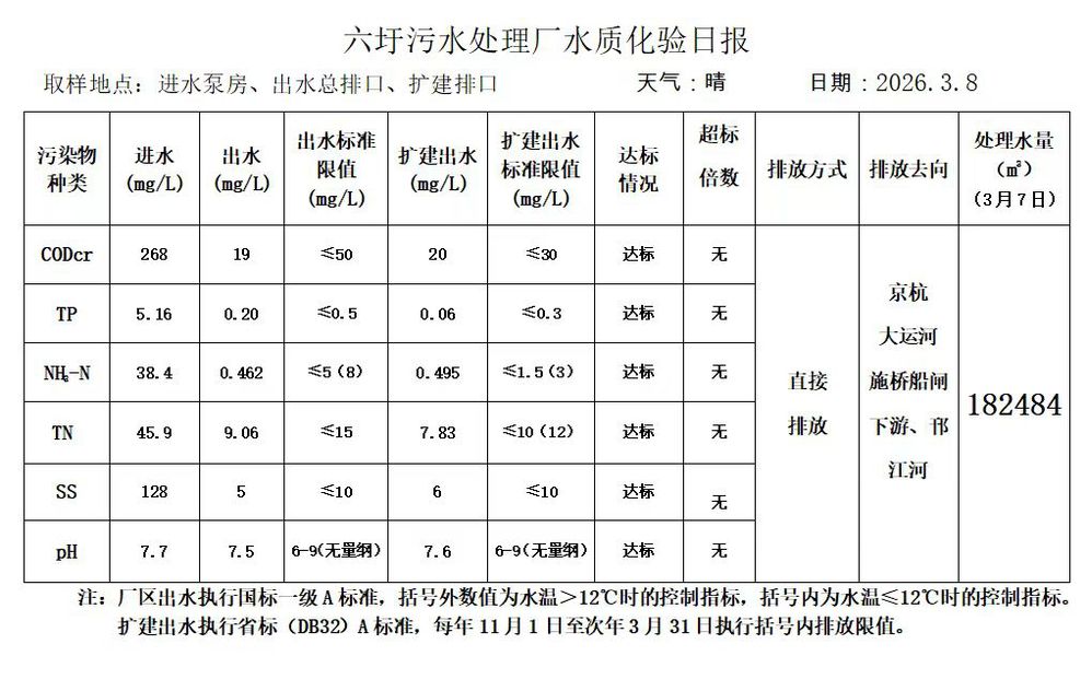 六圩污水处理厂水质化验日报(2026.3.8)