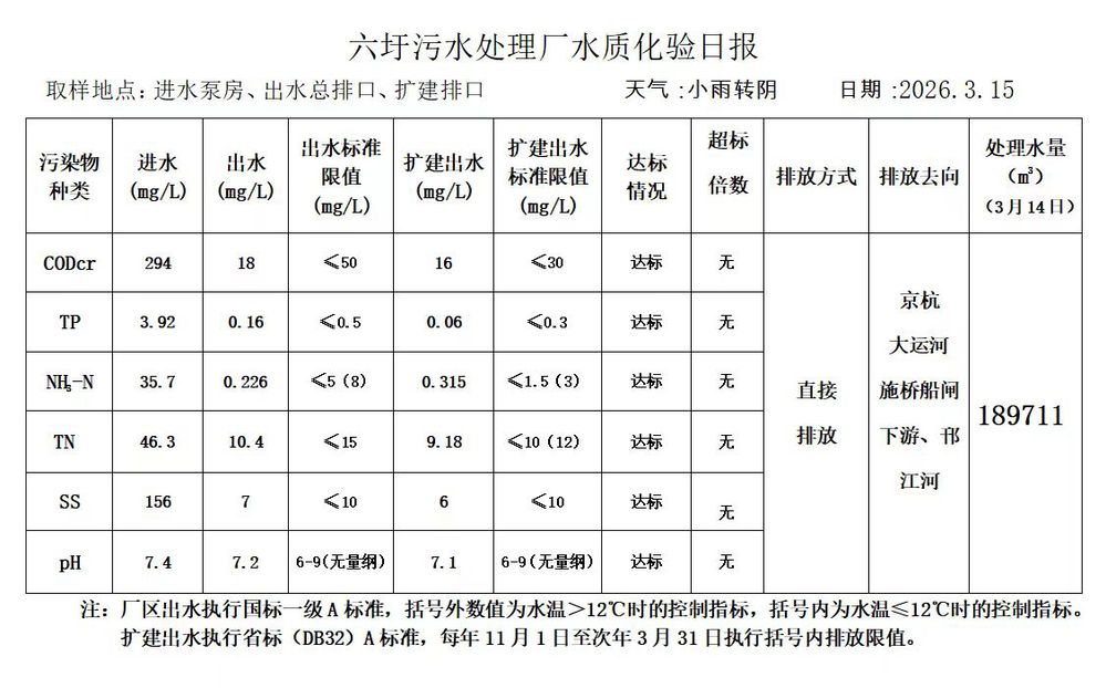 六圩污水处理厂水质化验日报(2026.3.15)