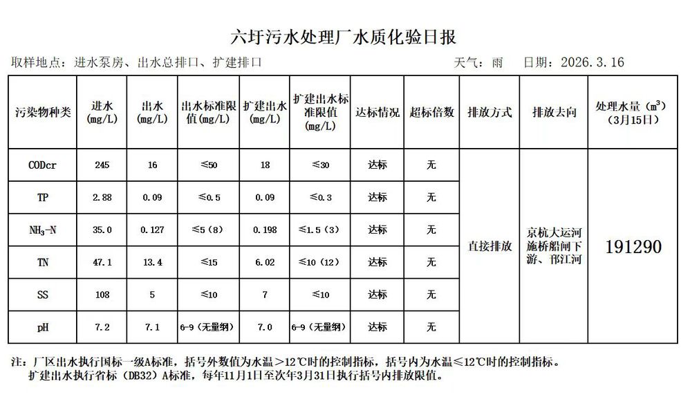 六圩污水处理厂水质化验日报(2026.3.16)