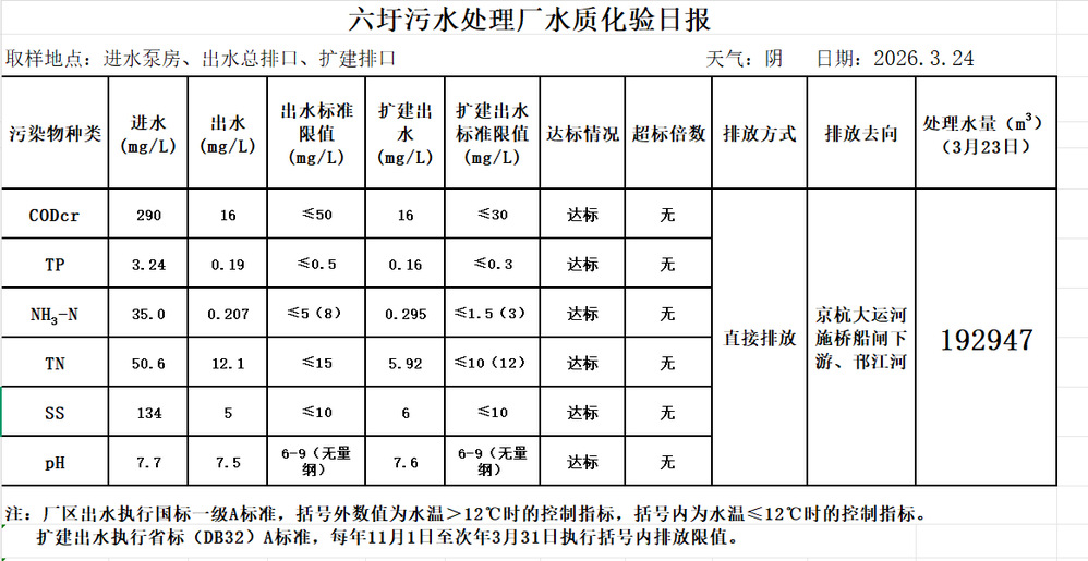 六圩污水处理厂水质化验日报(2026.3.24)