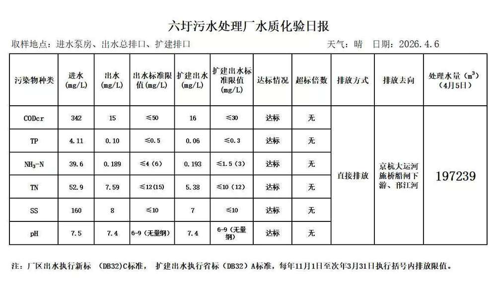 六圩污水处理厂水质化验日报(2026.4.6)
