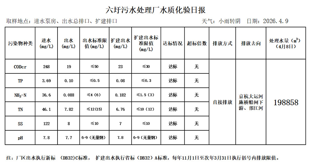 六圩污水处理厂水质化验日报(2026.4.9)