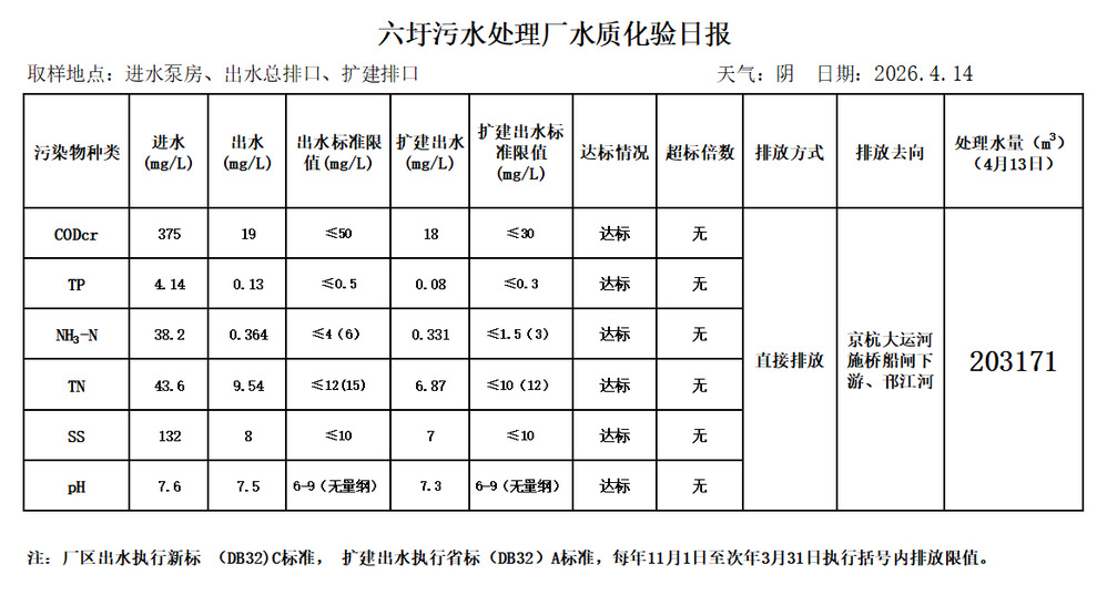 六圩污水处理厂水质化验日报(2026.4.14)
