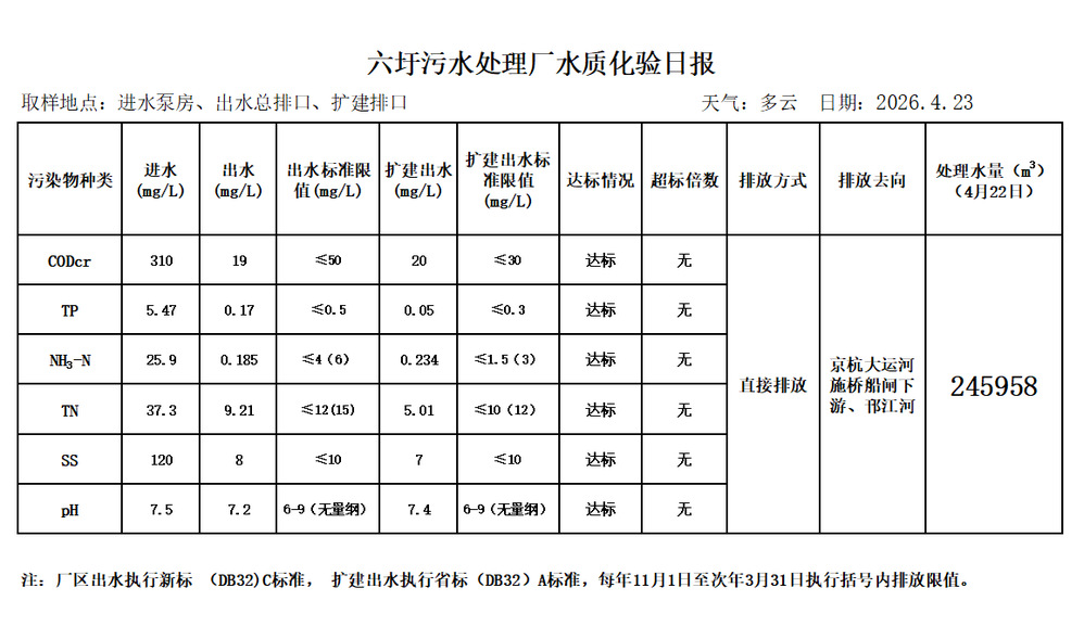 六圩污水处理厂水质化验日报(2026.4.23)